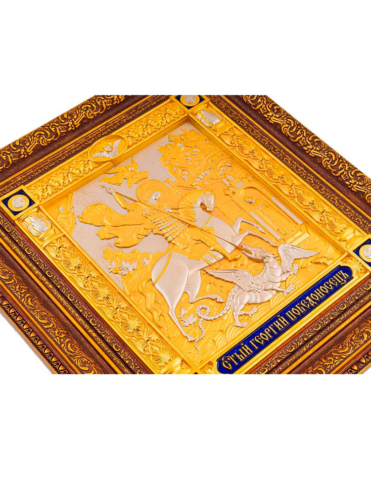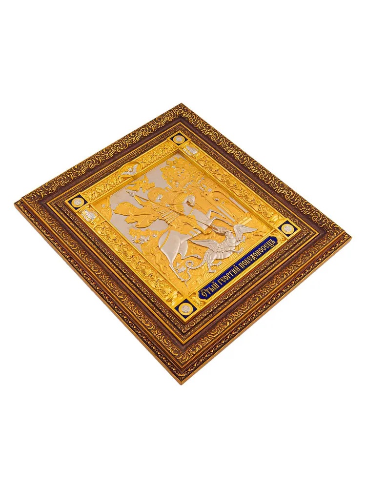 Икона «Георгий Победоносец» изготовлена мастерами Златоуста с применением операций покрытия никелем и золотом 999. Святой великомученик изображен в момент совершения самого знаменитого своего подвига - победой над змеем и спасения принцессы.