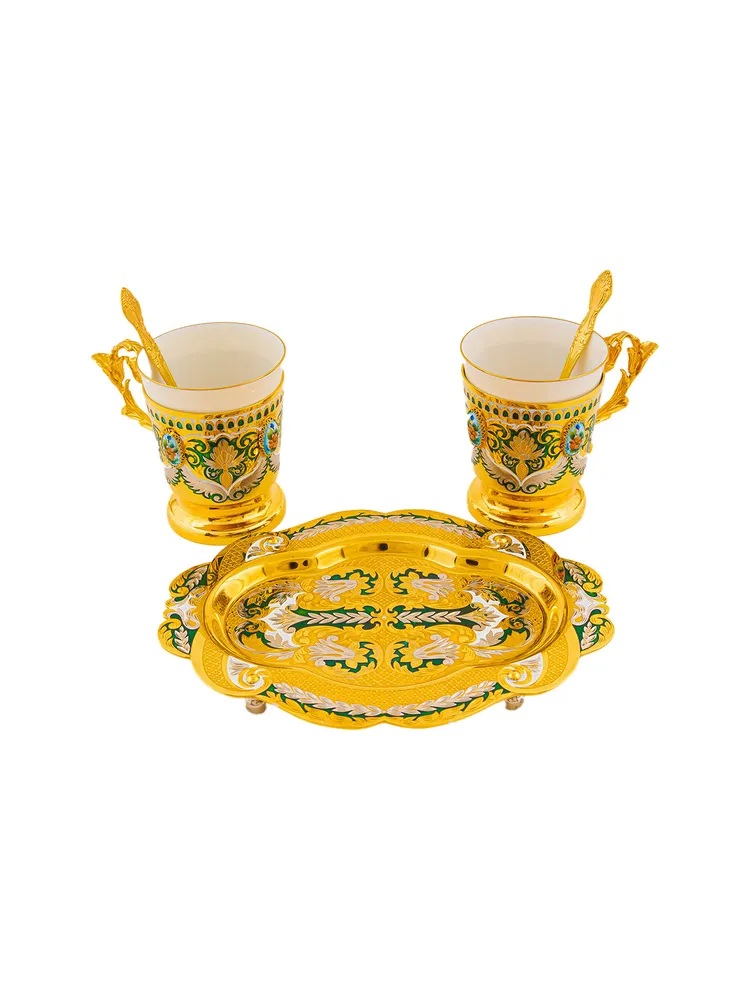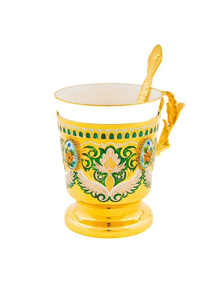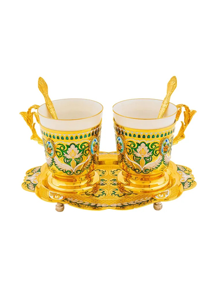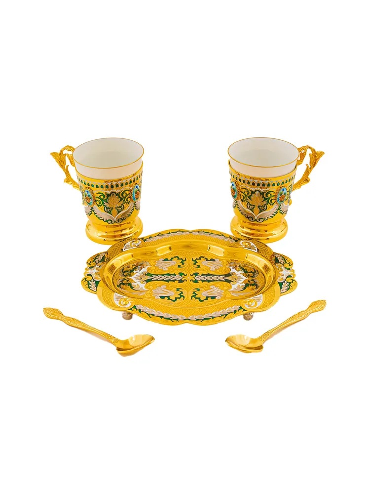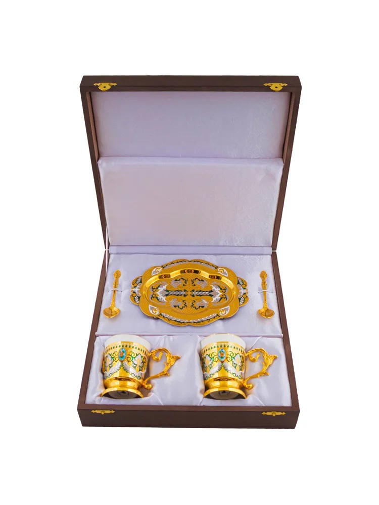 Чайно-кофейный набор "Мелодия России"- идеальный подарок для пары, влюбленной в хороший чай или кофе. Этот изысканный набор - именно то, что вам нужно! Стильный императорский фарфор в блестящих золоченых подстаканниках со вставками из финифти на лотке из латуни, покрытые никелем и золотом с добавлением художественной эмали -выполнены в традициях Златоустовской гравюры. В наборе также идут золоченые ложки из нержавеющей стали. Данный набор изготовлен в ручную и единичном экземпляре.