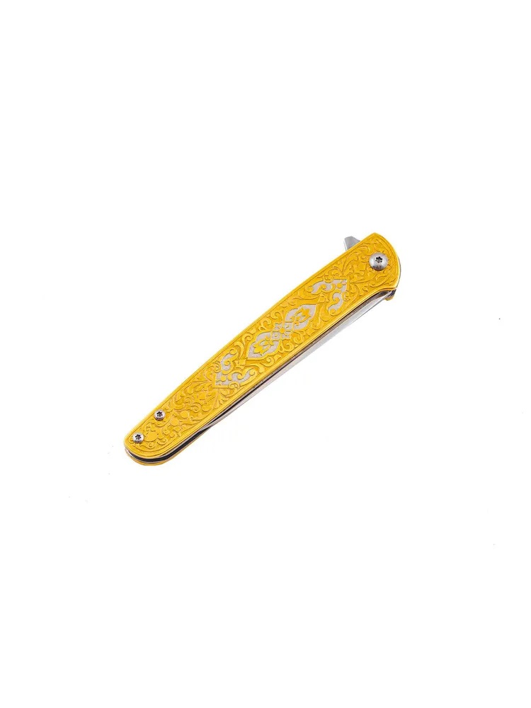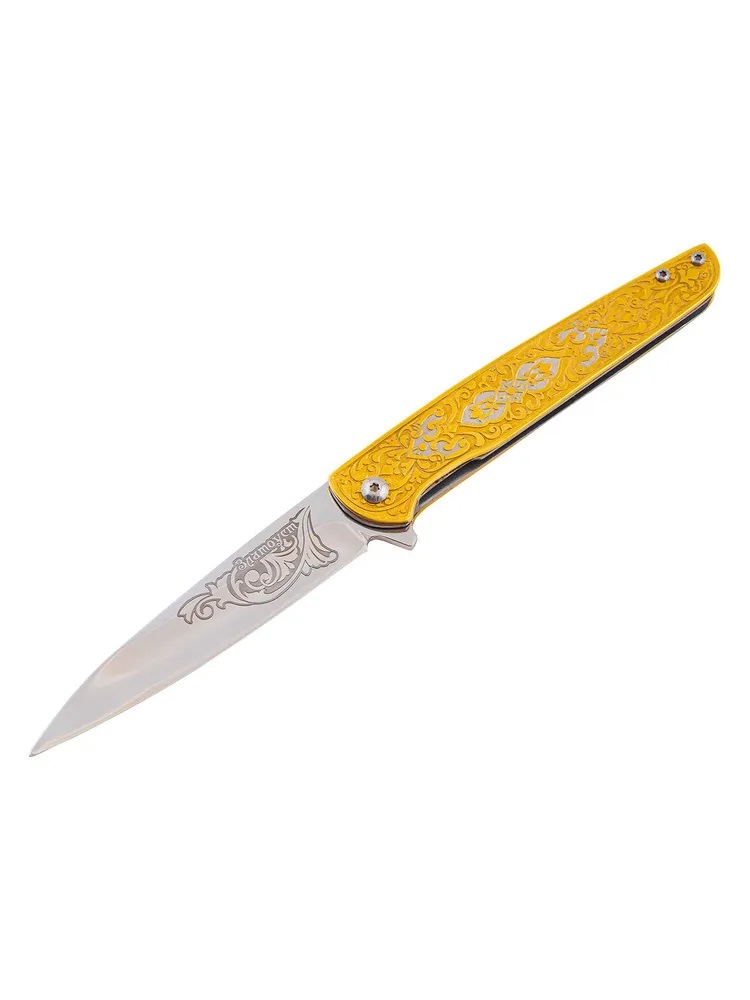 С давних времен производством украшенного оружия занимались лучшие мастера из Златоуста. Данная работа это то что вам нужно. Клинок из нержавеющей стали, а накладки из латуни украшены в технике Златоустовской гравюры на металле (гравировка, травления, никелирование, золочение). Мы предлагаем вам образец украшенного подарочного ножа-флиппера, которое выполнено с душой мастерами Златоуста.