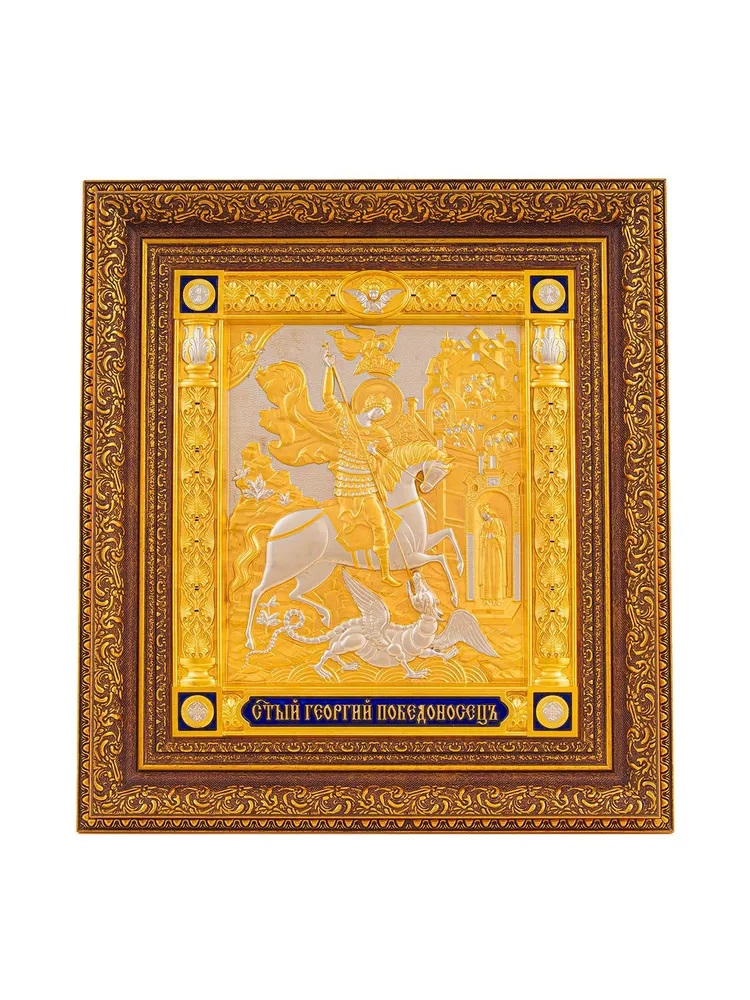 Икона «Георгий Победоносец» изготовлена мастерами Златоуста с применением операций покрытия никелем и золотом 999. Святой великомученик изображен в момент совершения самого знаменитого своего подвига - победой над змеем и спасения принцессы.